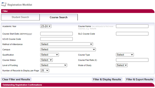 - Use the Course Search to bring up a list of students on the course. You can also use the Application Search to find a specific student.