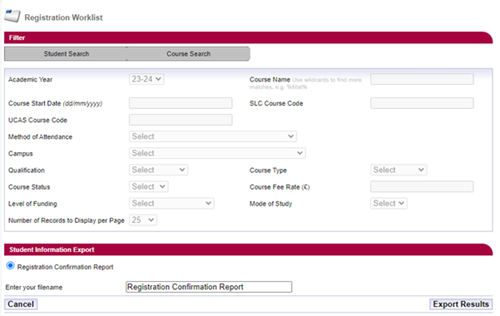 Students who need registration confirmations will appear on the registration confirmation worklist in this section. You can confirm registration individually or in bulk by a file import. Registration confirmations will release maintenance payments to students.