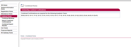 The Combined Home page lists the academic years where you have students with outstanding registration confirmations. It also has a menu with the following options: