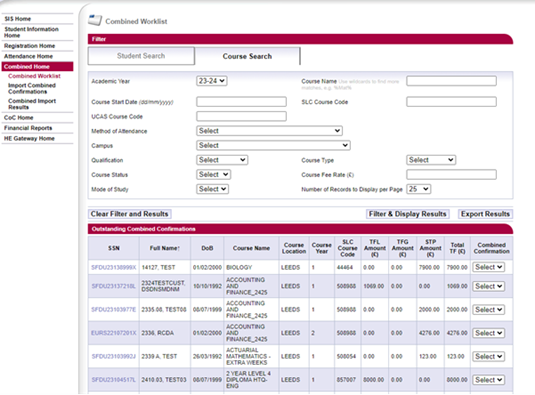 Students who need a combined confirmation will appear on the worklist 30 days before their course starts. Every student record will show the information explained below.