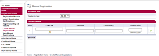 You'll sometimes need to register a student who has not yet appeared on the registration worklist. This is called manual registration and it is only available for full-time undergraduate students.