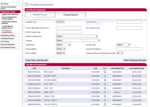 Once you run a search on the View Manual Registrations page, the search results will appear on screen. The top half of the page will show your search criteria. The bottom half will show the search results.