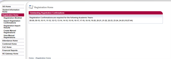 The Registration Home page lists the academic years where you have students with outstanding registration confirmations. It also has a menu with links to all the registration functions: